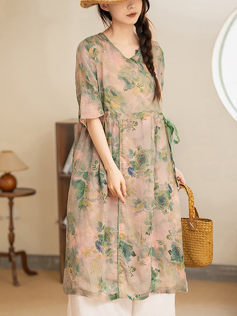 Experience ultimate comfort and breathability in this exquisite ramie dress with a delicate floral design. The vintage-inspired V-neck and half sleeves exude timeless elegance. Embrace the warmer seasons of spring and summer with this upscale piece.