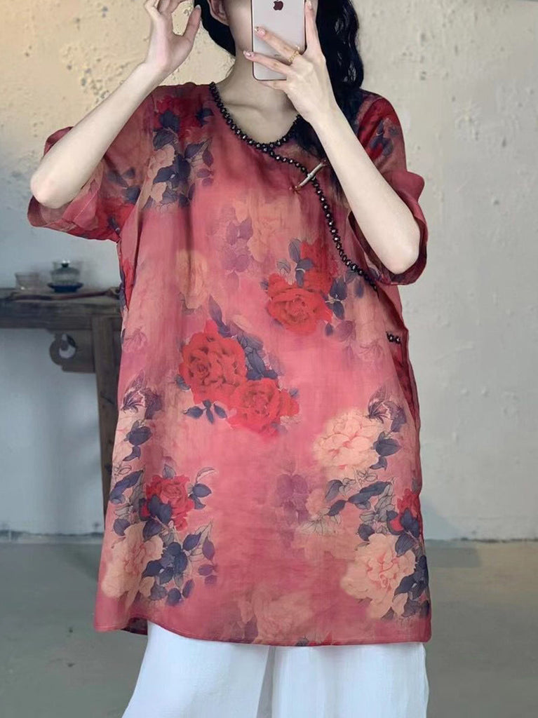 Women Summer Vintage Flower V-Neck Long Ramie Shirt IO1017
