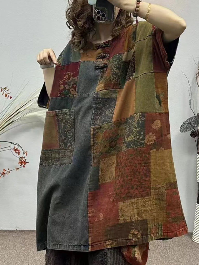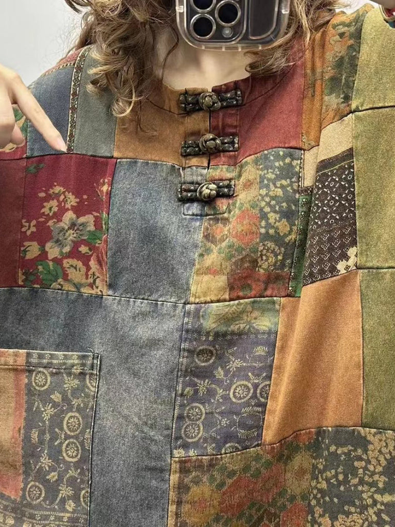 Indulge in the finest with our Women Summer Vintage Patch Spliced Buckle Long Shirt QW1003. Crafted from luxurious cotton and adorned with a stunning spliced pattern, this shirt boasts a sleek O-neck collar and half-sleeve length with the elegant raglan sleeve style. Embodying a touch of ethnic charm, this shirt is perfect for the spring and summer seasons.