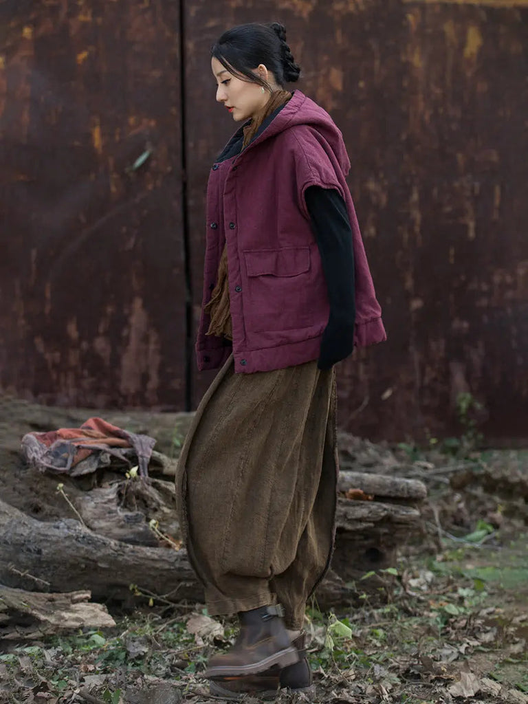 This product with a solid pattern and a hooded collar. The short and regular sleeves offer a vintage style, perfect for the autumn and winter seasons.