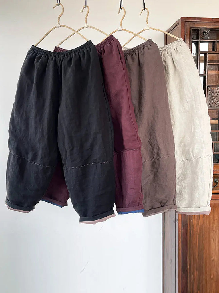 As a product expert, I wanted to mention that the Women Winter Retro Solid Linen Harem Pants are made from a blend of Linen and Cotton materials for a comfortable and stylish fit. These pants feature an elastic waistband and practical pockets, perfect for the Autumn, Spring, and Winter seasons. You can count on the ankle-length design to keep you warm and fashionable.