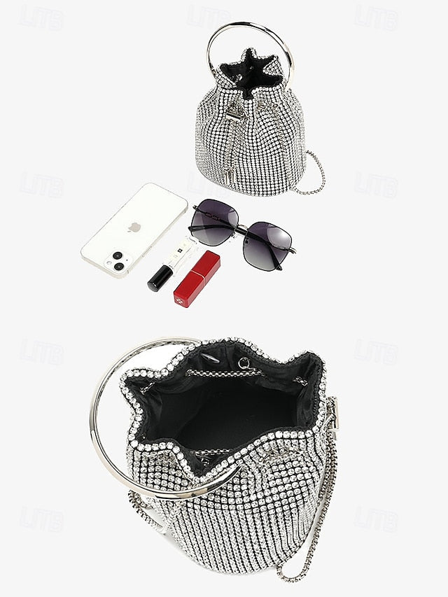Women's Sparkling Silver Rhinestone Bucket Bag with Metal