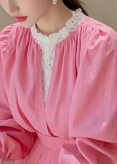 Slim Fit Pink Lace Patchwork Cotton Blouse Fall