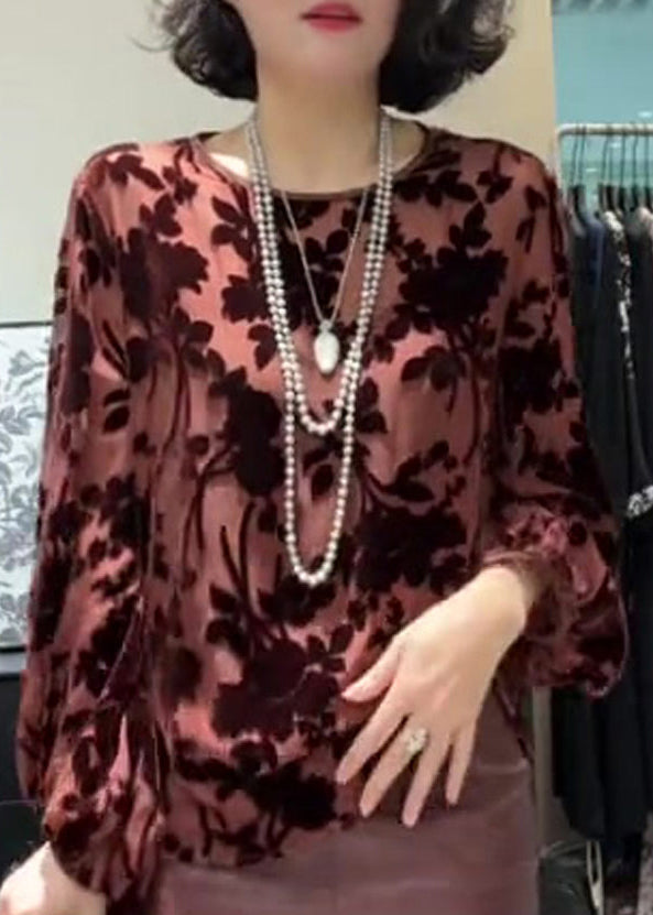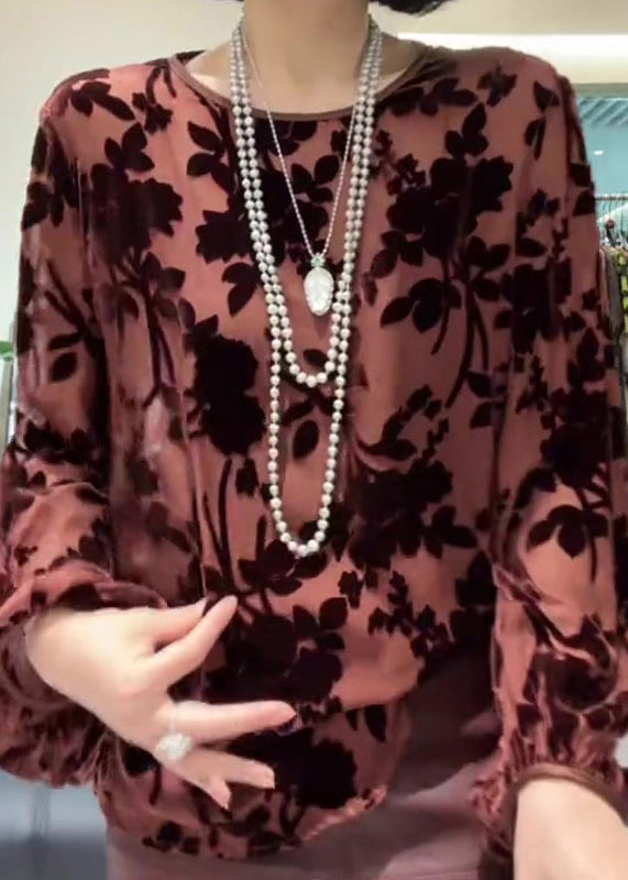 French Pink O Neck Jacquard Silk Velour Blouse Tops Fall WP039
