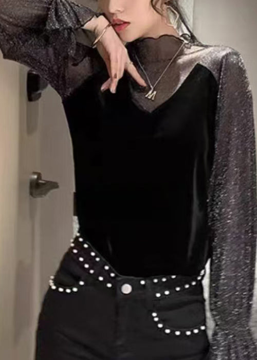 Stylish Black Tulle Patchwork Silk Velour Blouses Flare Sleeve WM020