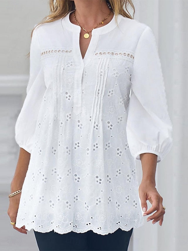 Tops Type: Blouse, Fabric: Polyester, Gender: Women's, Occasion: Daily, Design: Eyelet, Style: Daily, Elegant, Casual, Stylish, Category: Shirt, Fit Type: Regular Fit, Neckline: V Neck, Sleeve Length: 3/4 Length Sleeve, Elasticity: Inelastic, Look After Me: Washable, Hand wash, Machine wash, Top Length: Regular Tops, Pattern: Solid Color, Season: Spring, Fall, Summer,