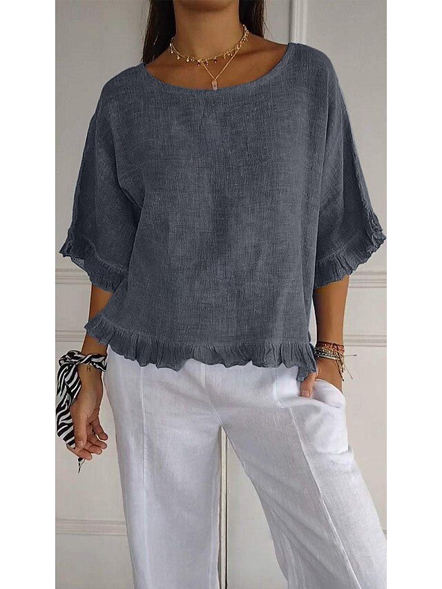 Fabric: Cotton, 100% Cotton, Tops Type: Blouse, Gender: Women's, Design: Ruffle, Occasion: Daily, Holiday, Style: Stylish, Casual, Category: Top, Fit Type: Regular Fit, Neckline: Crew Neck, Sleeve Length: Half Sleeve, Elasticity: Inelastic, Look After Me: Hand wash, Machine wash, Top Length: Regular Tops, Pattern: Solid Color, Season: Spring, Summer, Fit EU Size: S:36;M:38;L:40;XL:42;2XL:44-46, Fit UK Size: S:8;M:10;L:12;XL:14;2XL:16-18, Fit US Size: S:4;M:6;L:8;XL:10;2XL:12-14,
