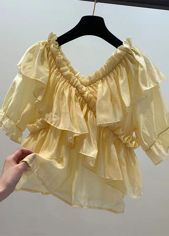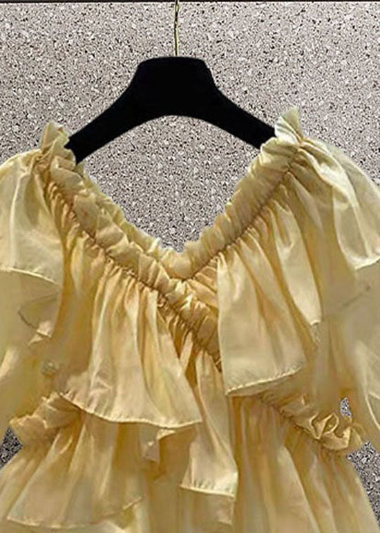 Yellow Patchwork Chiffon Blouses Ruffled V Neck Summer