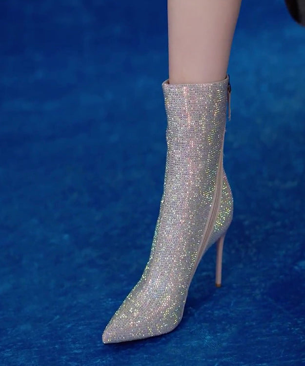 Silver Stiletto Zircon Handmade Splicing Boots Fuzzy Wool Lined TE010