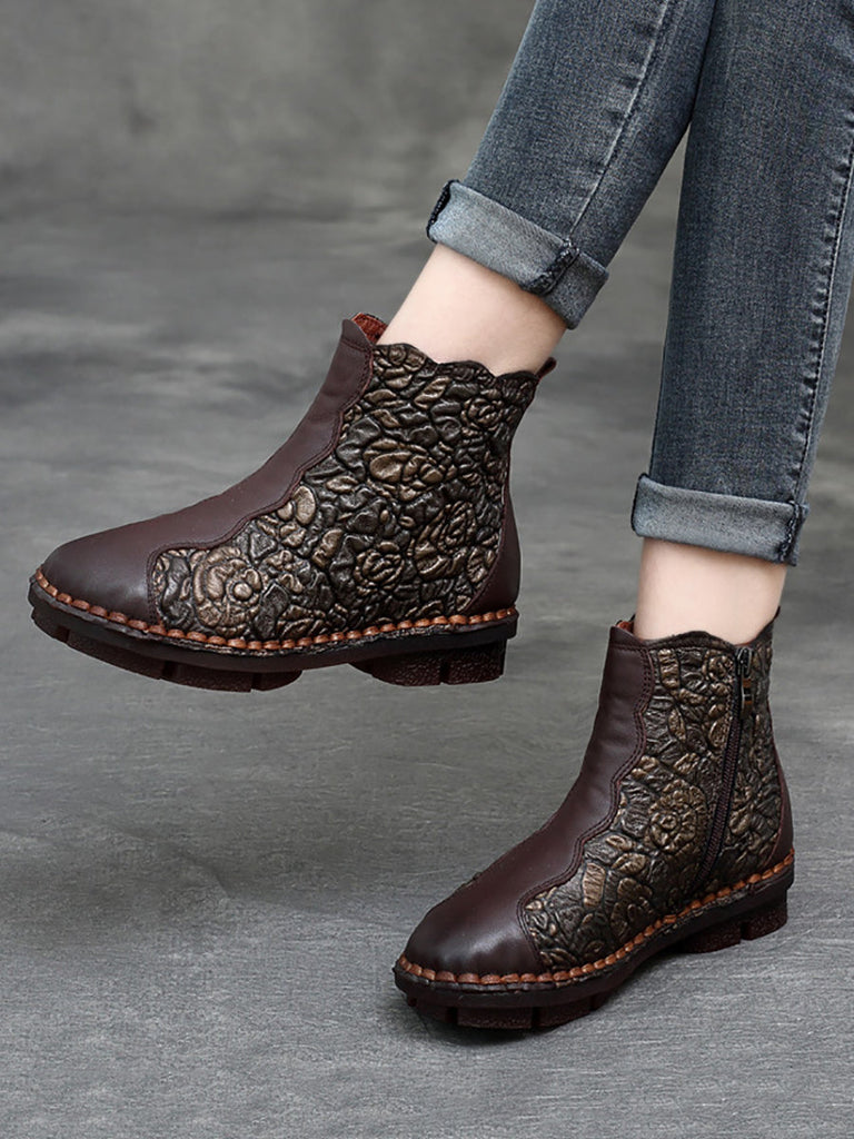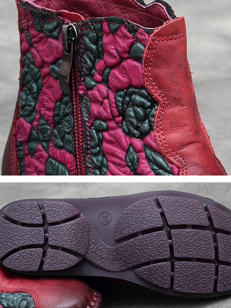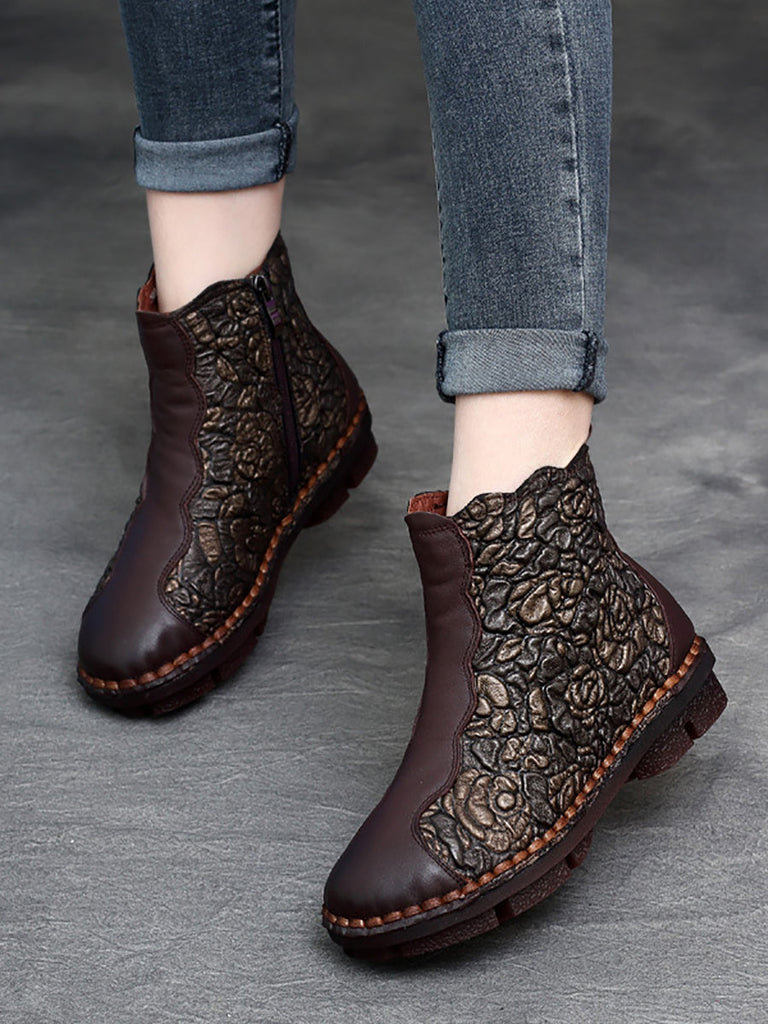 Indulge in luxury with our Women Retro Flower Leather Spliced Zipper Low Heel Boots. Crafted with intricate floral detailing, these boots exude elegance and style. The low heel offers comfort while the zipper ensures a secure fit. Elevate your wardrobe with these sophisticated and exclusive boots.