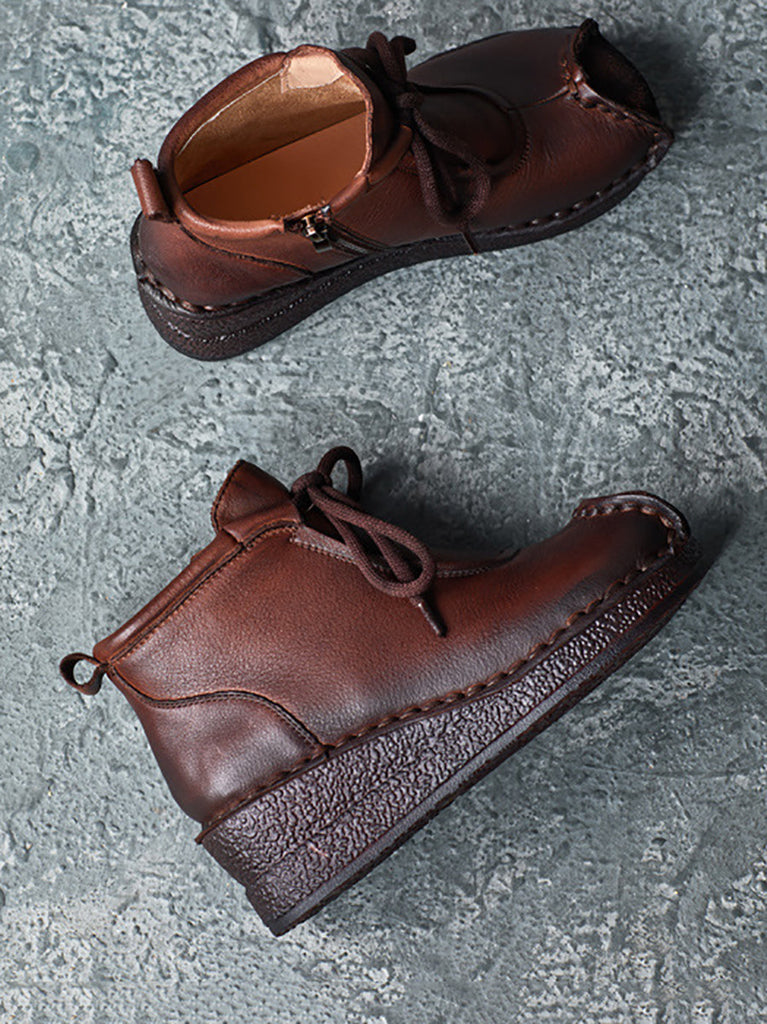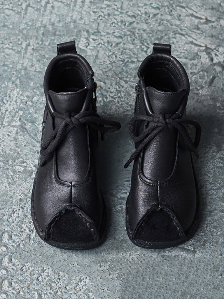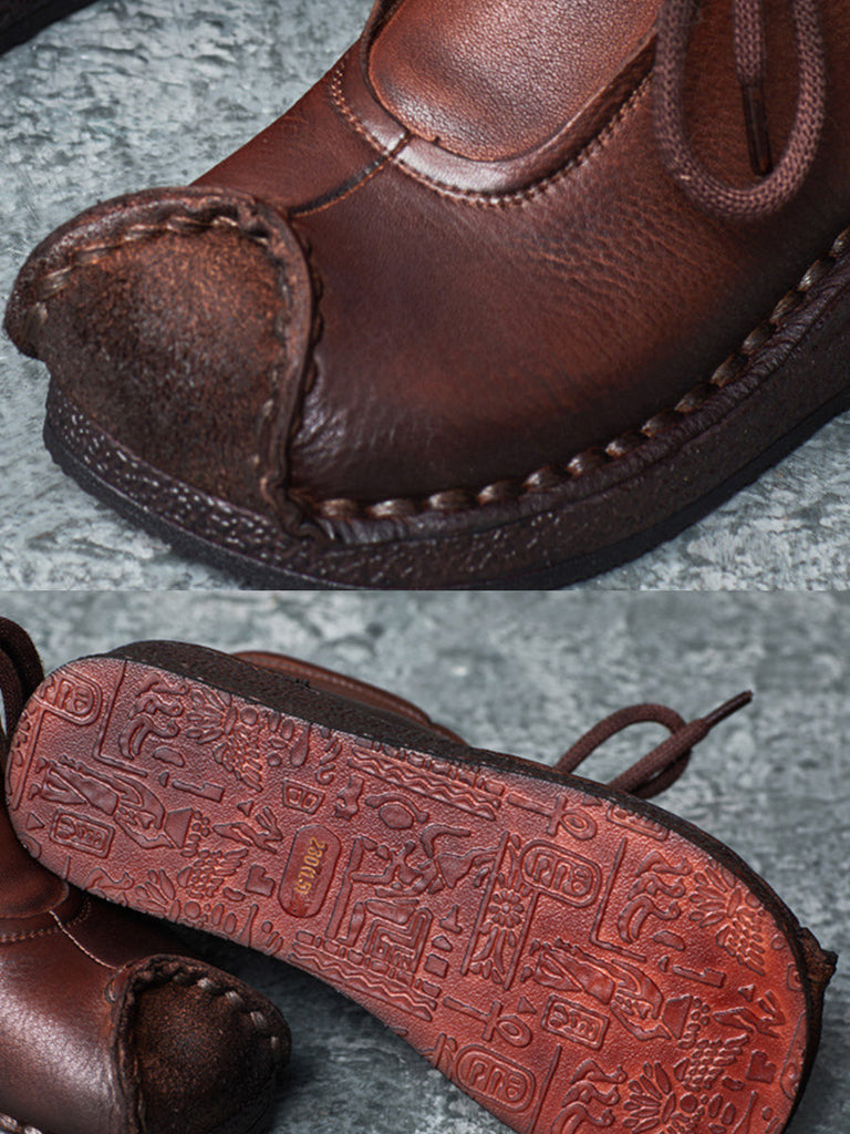 Women Vintage Genuine Leather Spliced Strap Mid-Heel Boots QU019