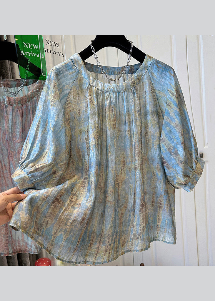 Handmade Blue O Neck Tie Dye Chiffon Top Bracelet Sleeve