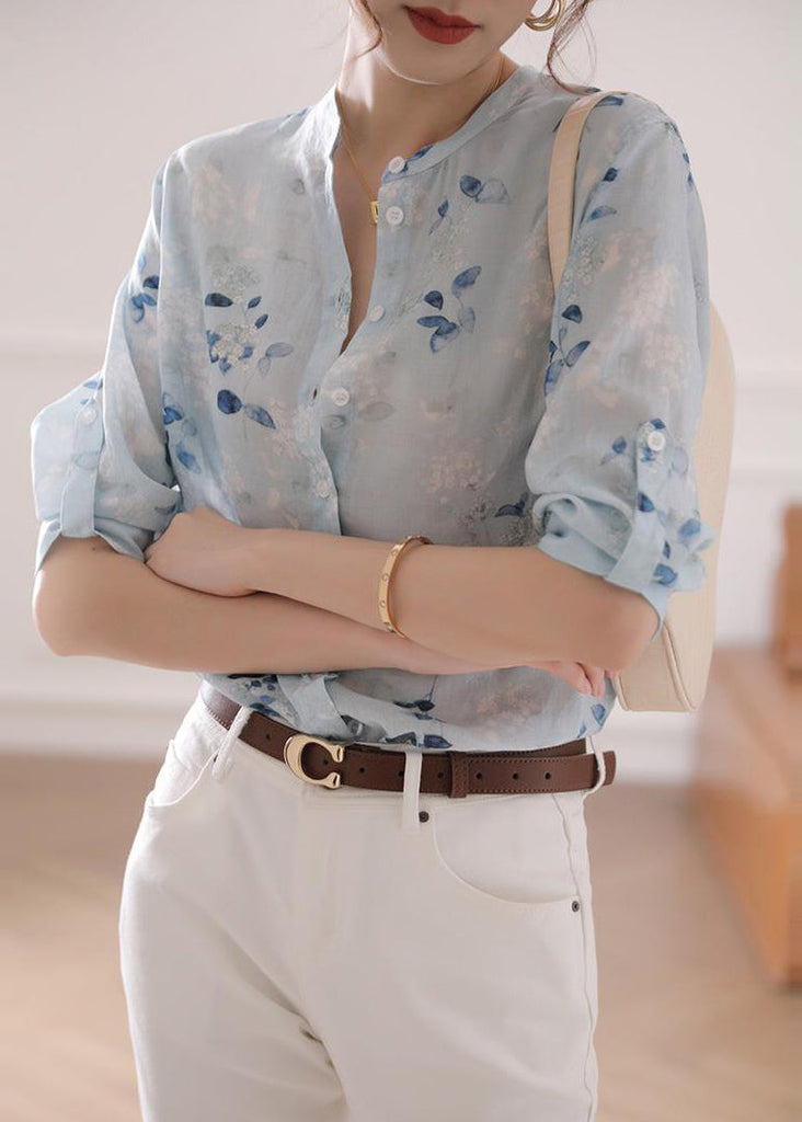 A sophisticated and exclusive top featuring a tasteful light blue print on high-quality linen fabric, with bracelet sleeves for added elegance. This Casual Light Blue Print Linen Top is the epitome of luxury and style.