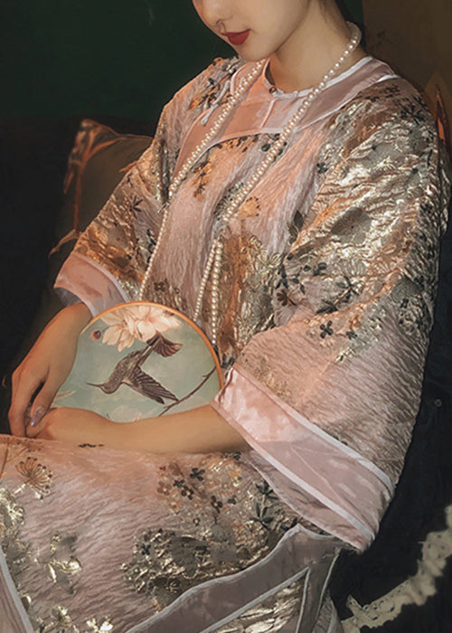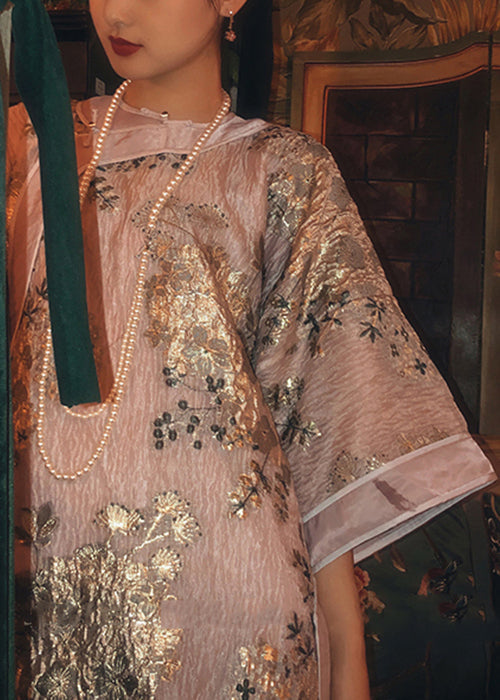 Chinese Style Pink Button Side Open Cotton Mid Dress Bracelet Sleeve QA1005