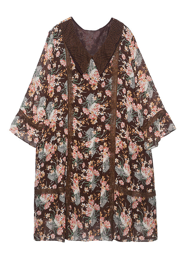 Fitted Coffee Peter Pan Collar Patchwork Print Chiffon Dresses Bracelet Sleeve