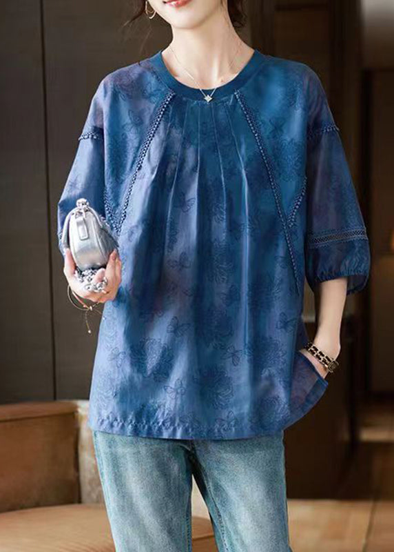 Expertly crafted with a beautiful blue O-neck and butterfly print design, this top features a unique bracelet sleeve. Handmade with precision, it is sure to become a staple in your wardrobe.