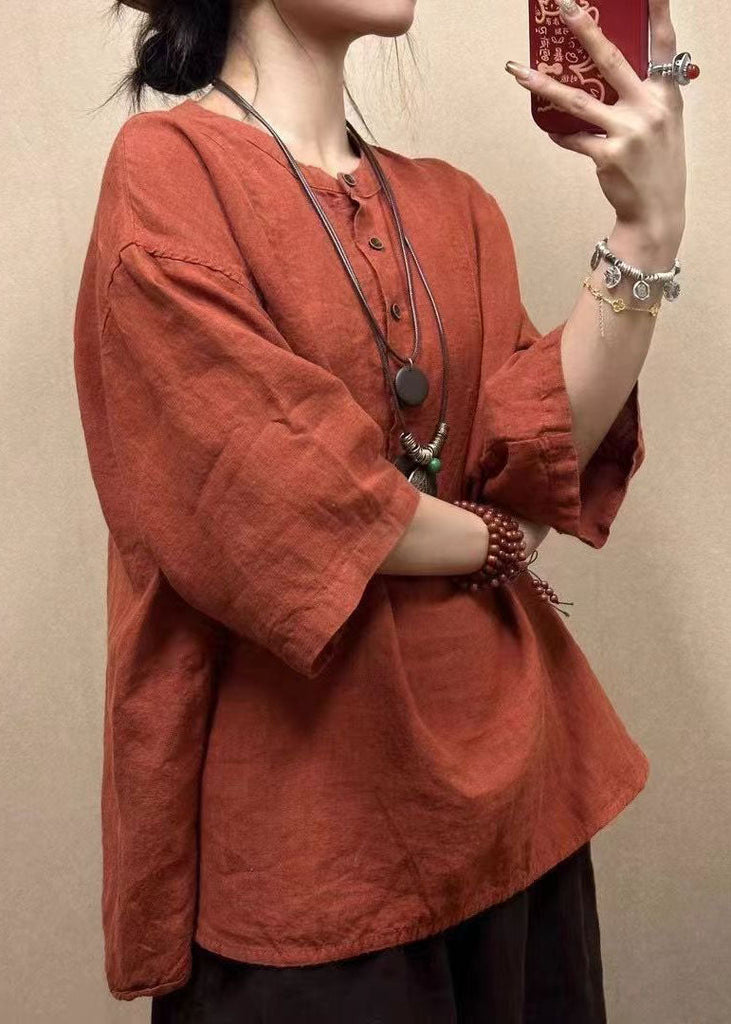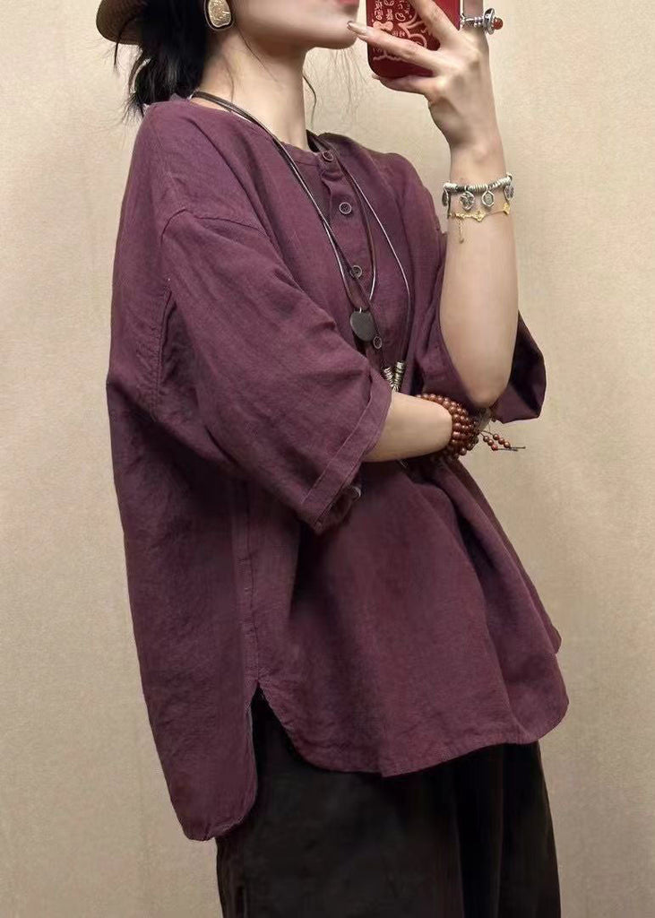 Loose Dark Red O-Neck Button Cotton Top Bracelet Sleeve FF038 MZF-HTP240607