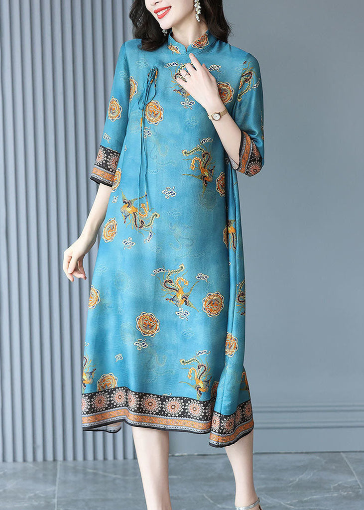 Natural Blue Mandarin Collar Print Silk Long Dress Bracelet Sleeve FR2015
