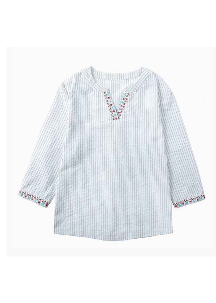 New Blue Embroidered Striped Cotton Blouses Bracelet Sleeve TH024
