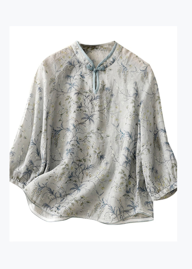 Organic Blue Stand Collar Print Cotton Top Bracelet Sleeve AM1046