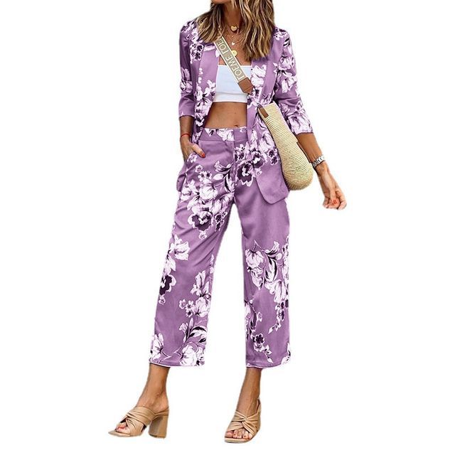 Product Title :Set: 3/4-Sleeve Floral Blazer + Wide Leg Cropped Pants