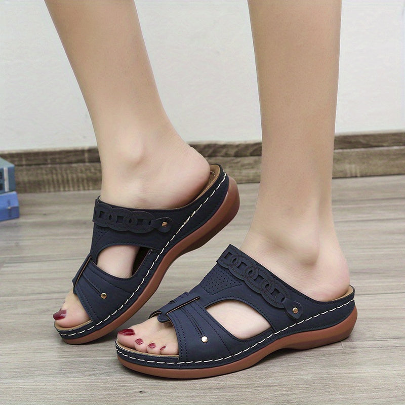 Women's Retro Low Wedge Slippers, Cut-out Open Toe Non Slip Arch Support Slides Shoes, Casual Outdoor Slippers SE1037
