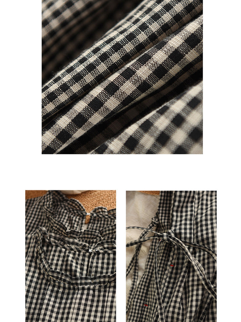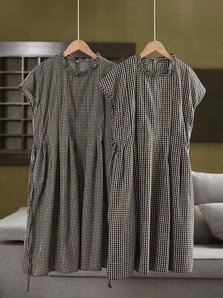 Women 100%Cotton Vintage Collar Plaid Dress Stand Summer FashionChic