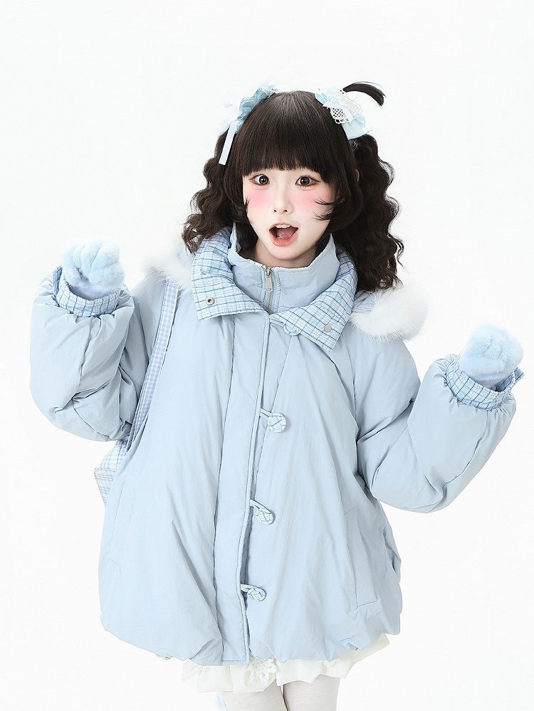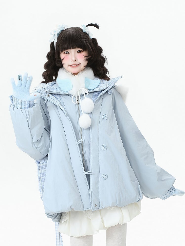 Daily Kawaii Light Blue Two-piece Down Coat with Detachable Hood, Plaid Pattern & Snap-button Cuffs