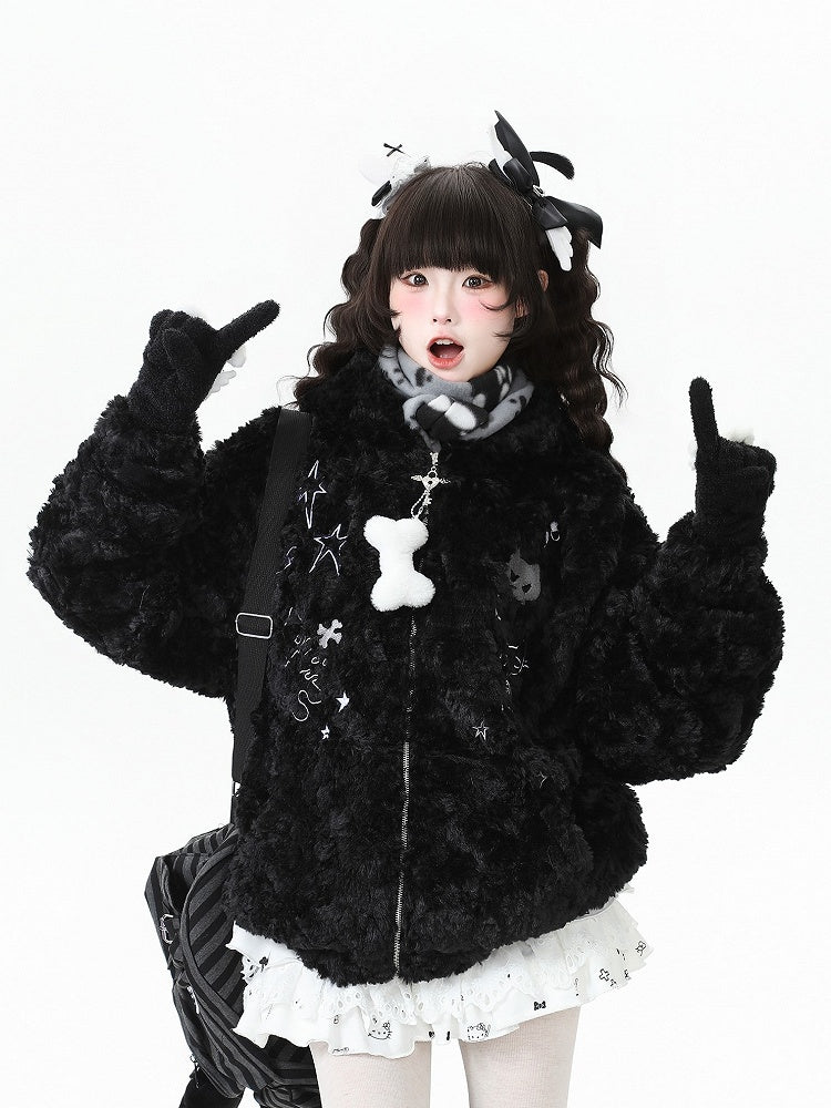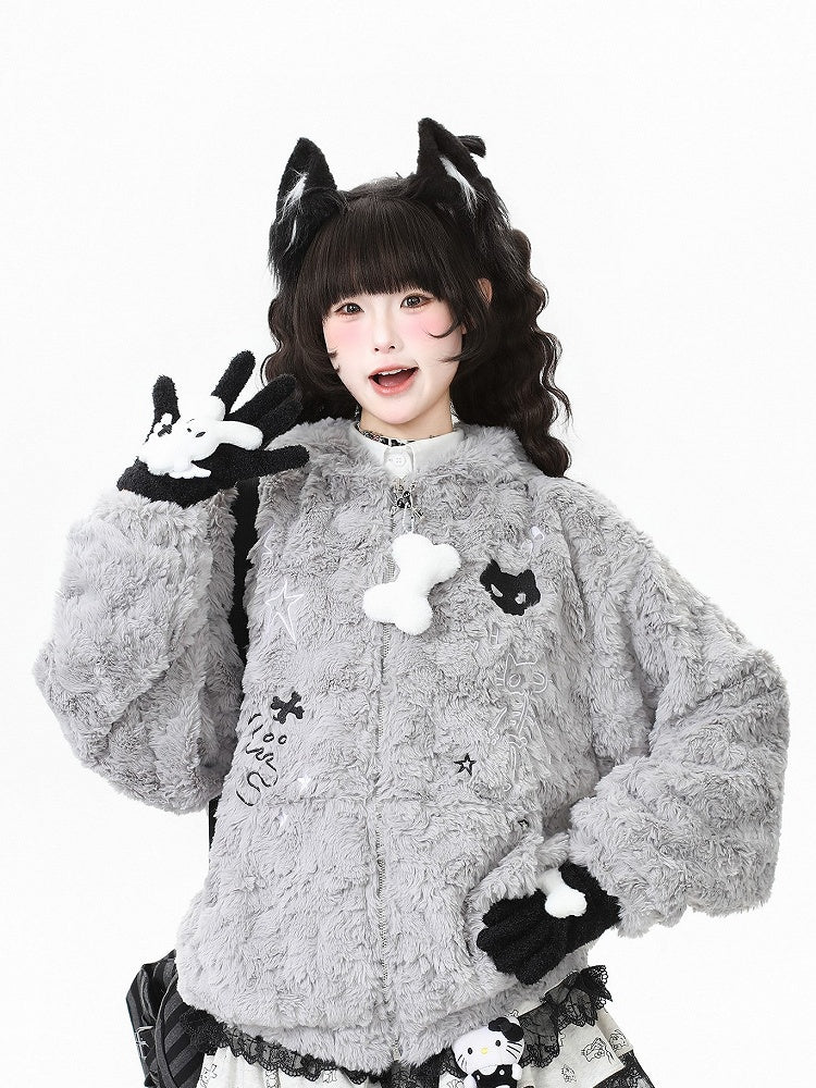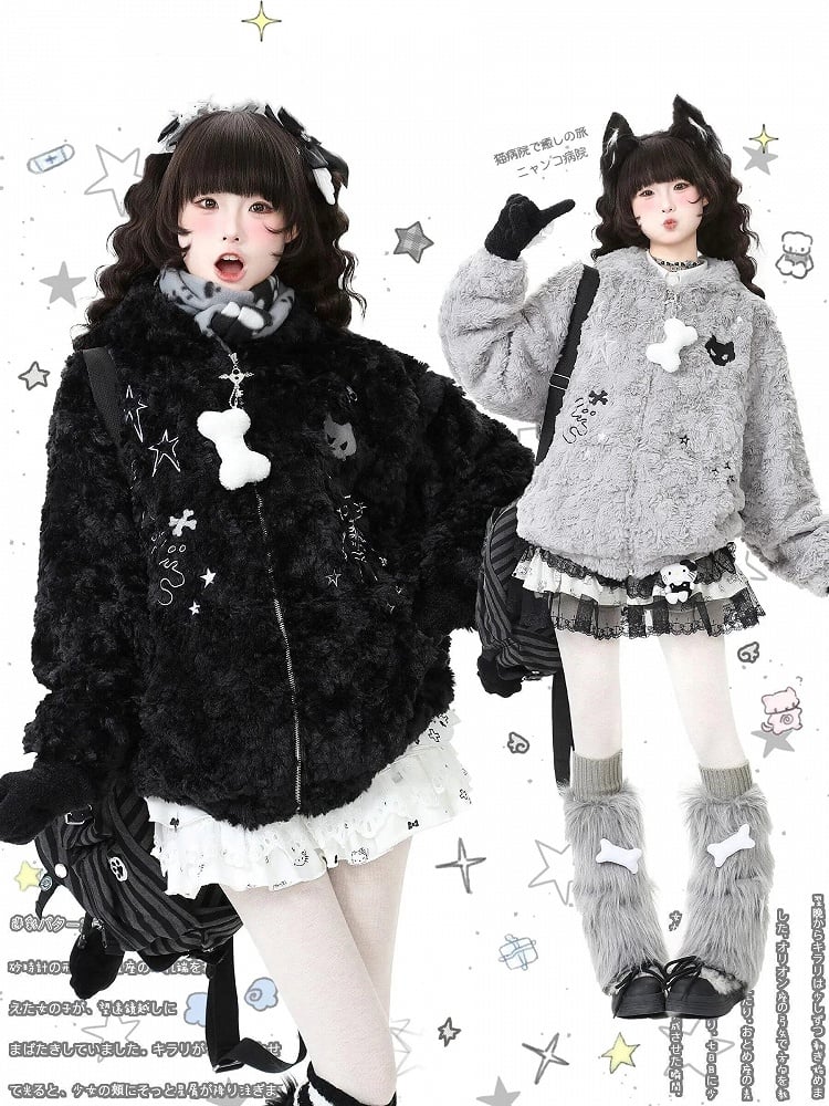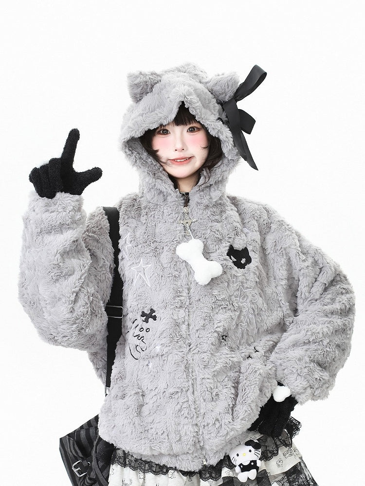 Black/Grey Bittersweet Plush Hoodie Jacket with Star Pattern, Heart-shaped Winged Key Zipper & Cat Ear Accents