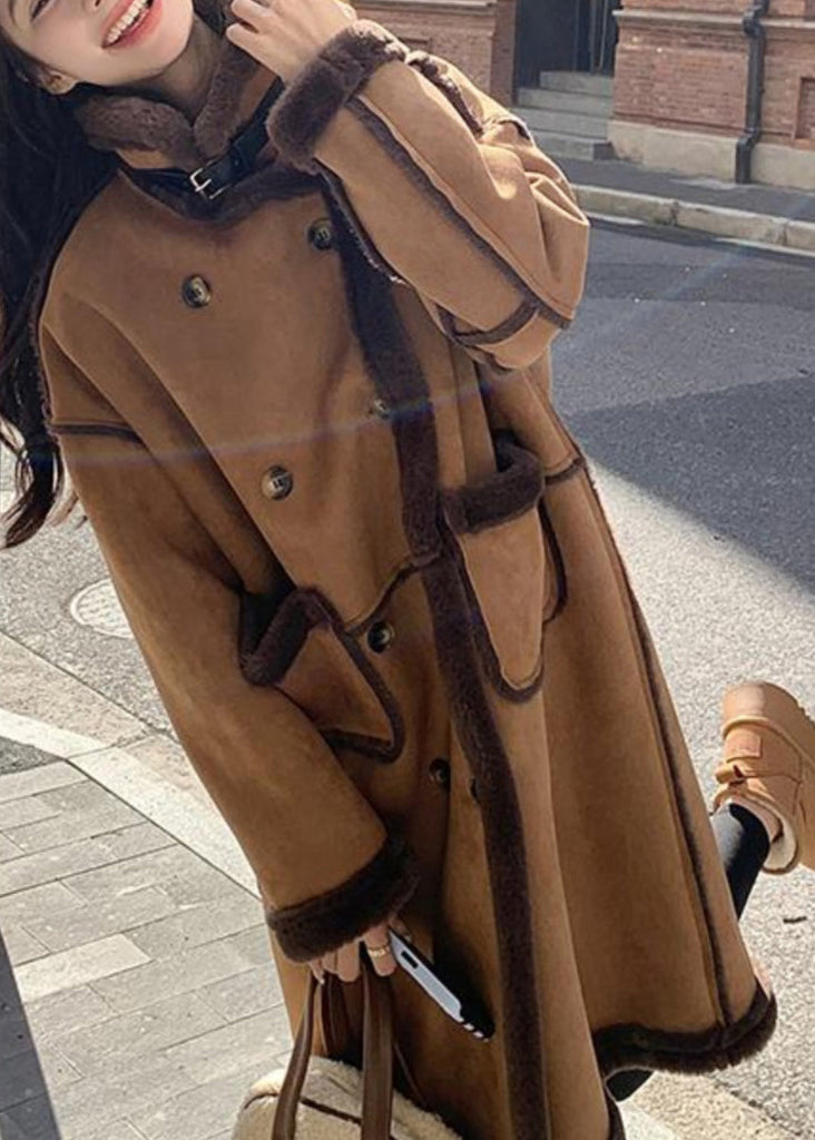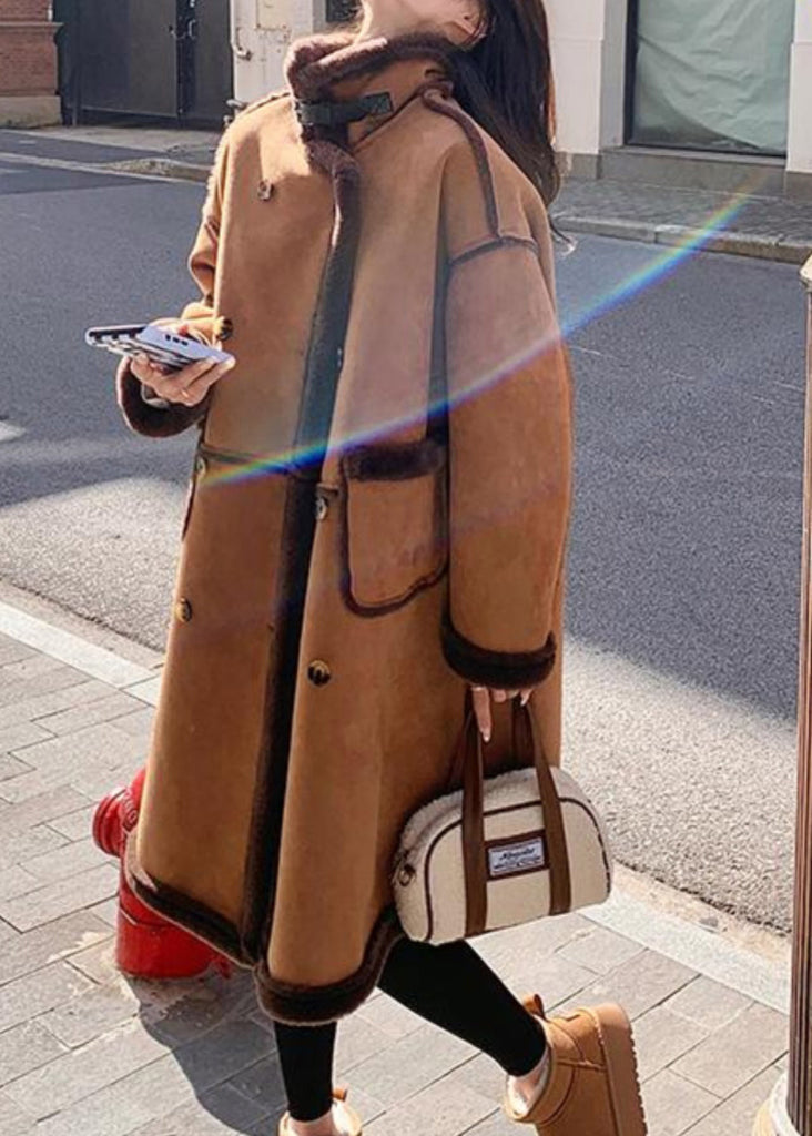 Boutique Khaki Pockets Patchwork Faux Suede Fleece Wool Lined Coat Winter YY008