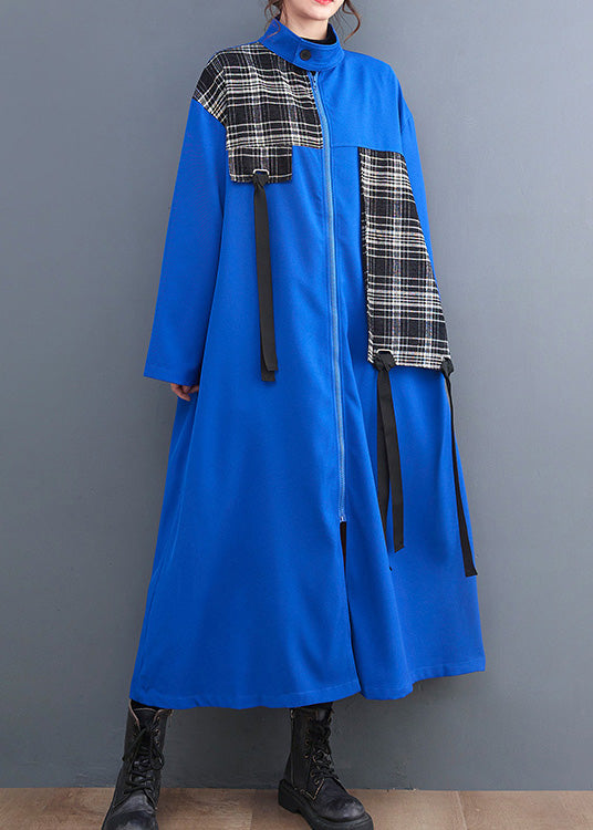 French Blue Peter Pan Collar Plaid Patchwork Zippered Long Trench Coats AC2073