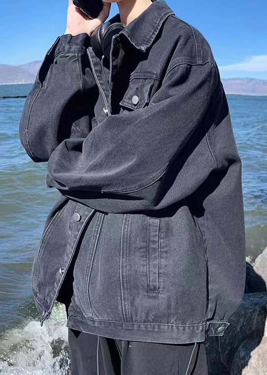 Loose Black Peter Pan Collar Pockets Denim Mens Coats Fall