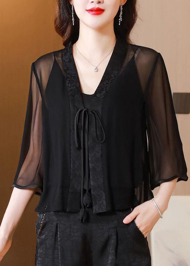Stylish Green V Neck Print Tie Waist Tulle UPF 50+ Coat Half Sleeve