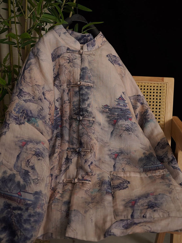 Women Autumn Vintage Print Button Stand Collar Ramie Coat AT1053