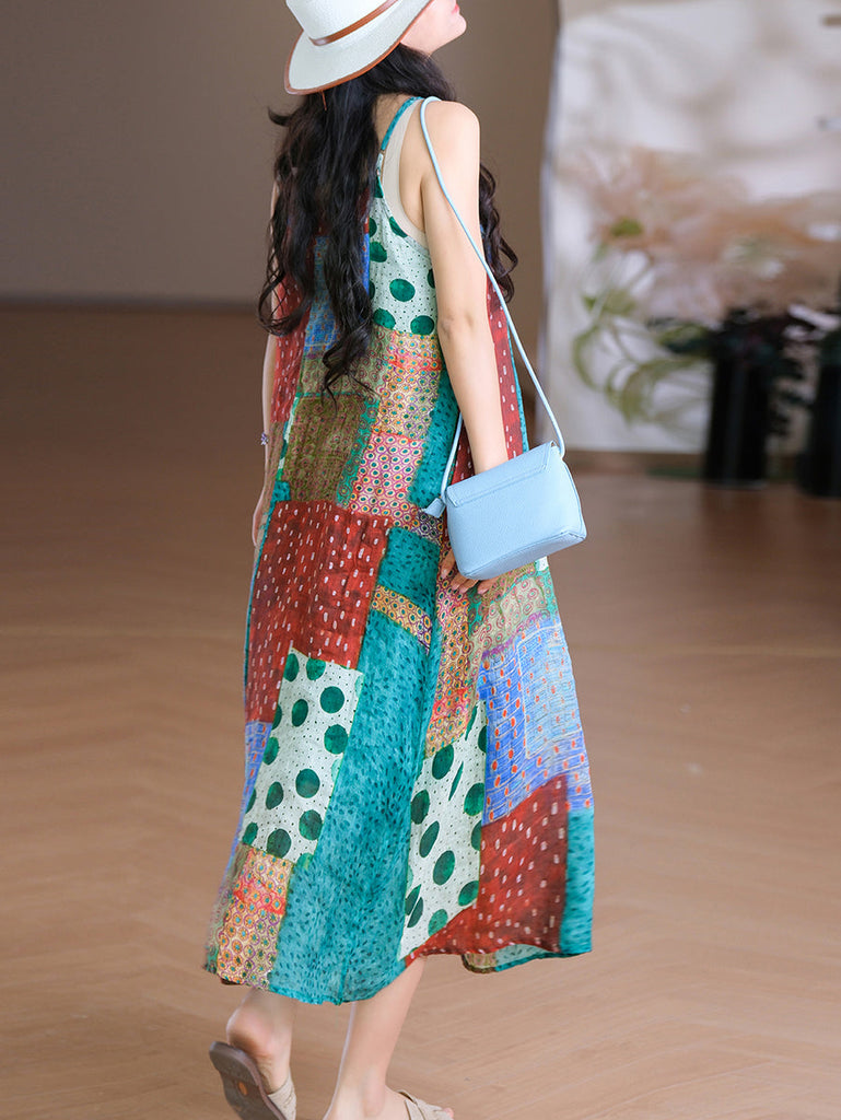 Women Vest O-Neck Artsy Summer Dress 100%Ramie Flower