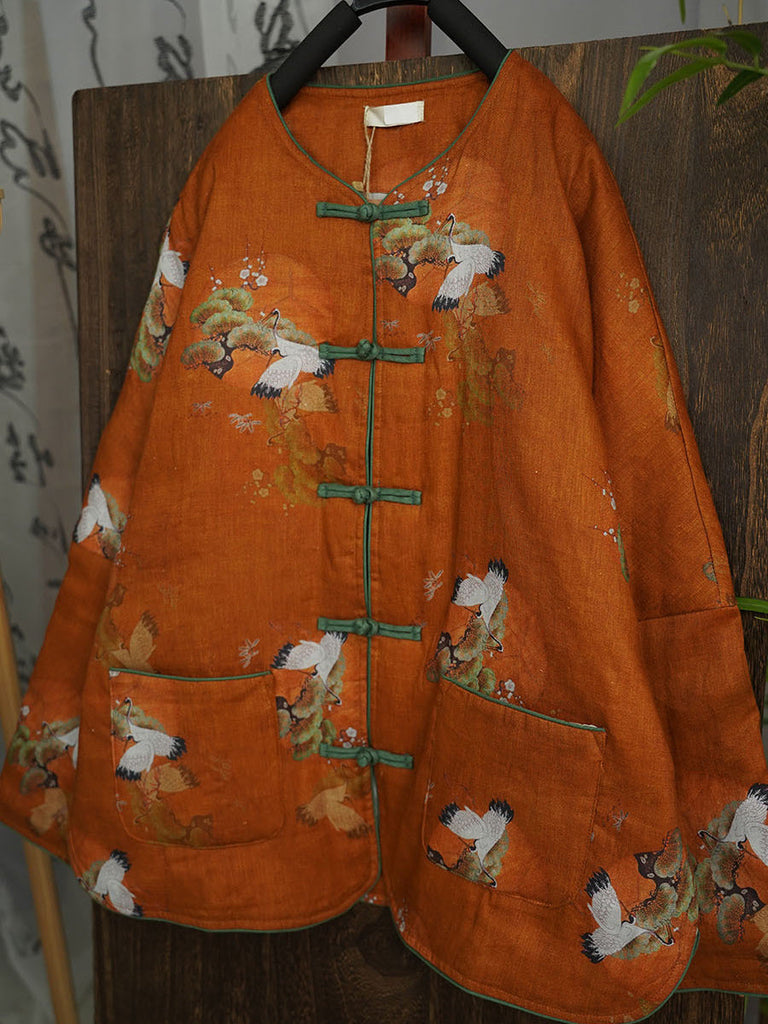 Women Vintage Crane O-Neck Print Linen Padded Coat QU005