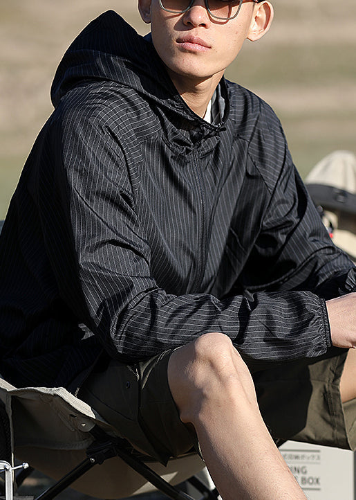 Black Striped Zippered Thin Ice Silk Men Coat Hooded