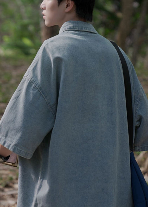Vintage Light Blue Peter Pan Collar Button Pockets Denim Shirts Mens Summer
