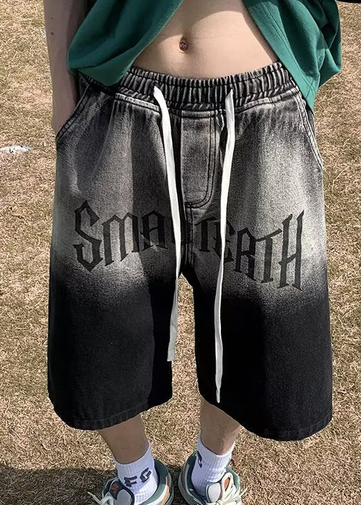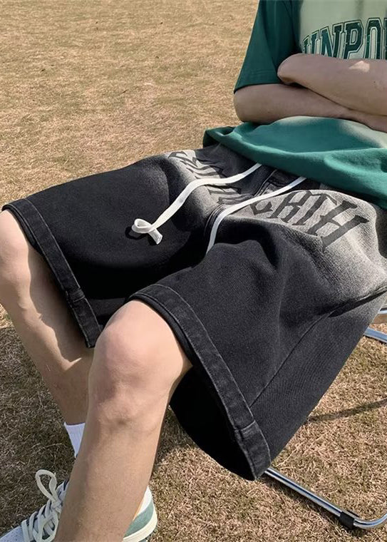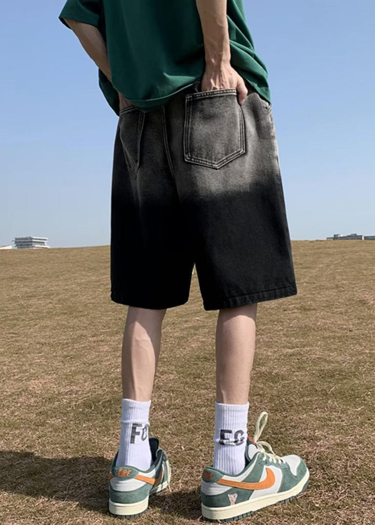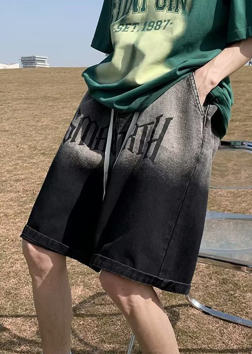 French Black Gradient Color Print Denim Elastic Waist Pockets Mens Shorts