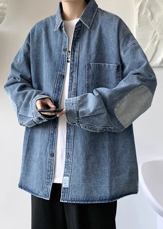 Mens Collar Denim Patchwork Blue Simple Peter Shirts Pan Pockets