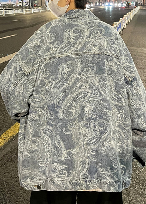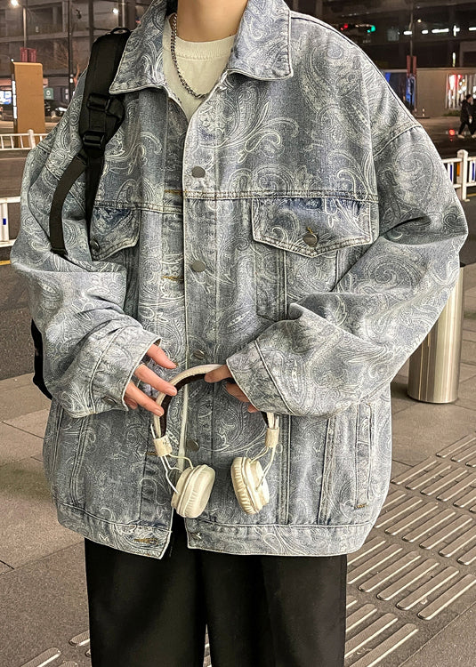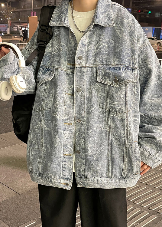 New Blue Peter Pan Collar Print Pockets Denim Mens Coats Fall WA023