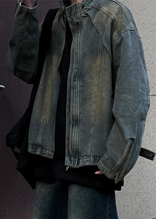 Vintage Blue Zip Up Denim Mens Coats Stand Collar Fall WA024