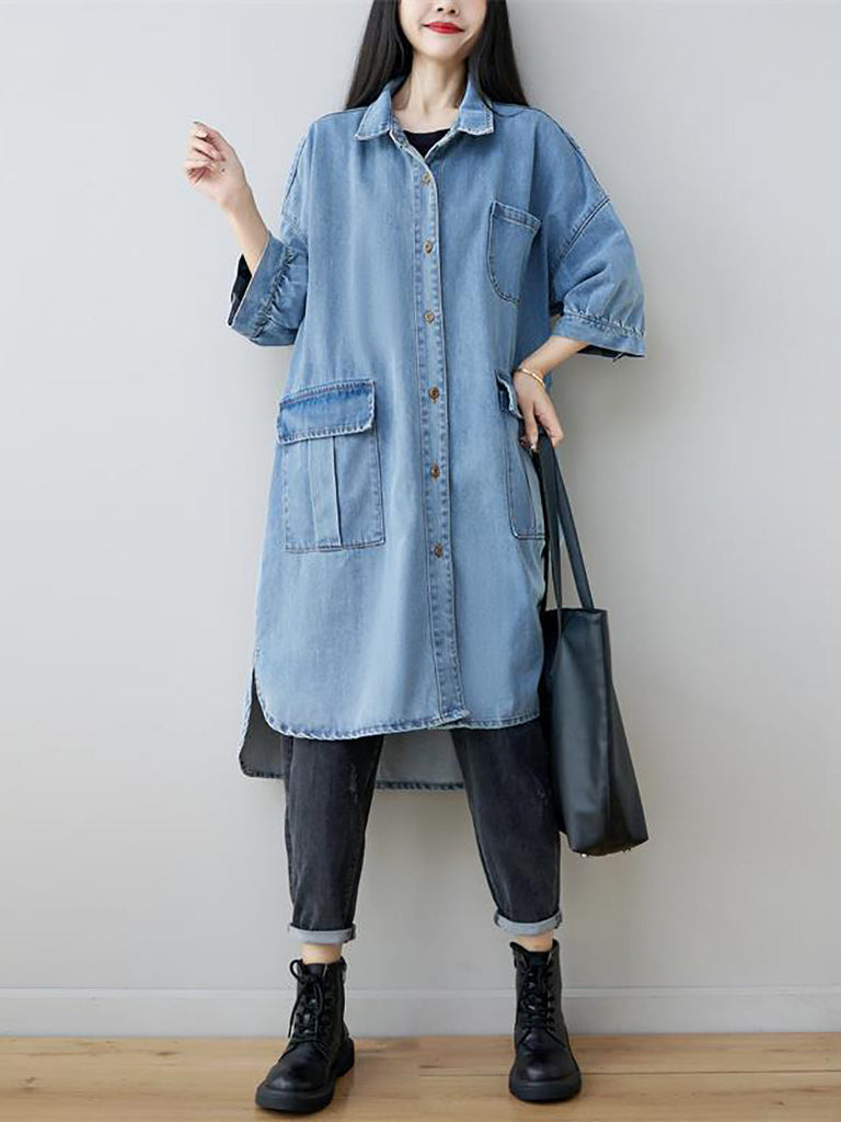 Women Autumn Vintage Three Quarter Sleeve Loose Denim Shirt Dress AS1035