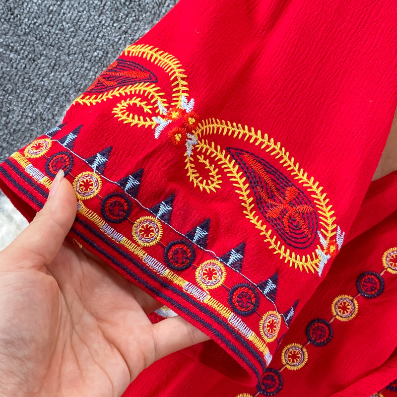Vintage Green V-neck Tie Waist Flower Embroidery Three-quarter Sleeve A-line Dress AR1022