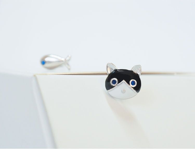 925 Sterling Silver Cat and Fish Non-matching Earring