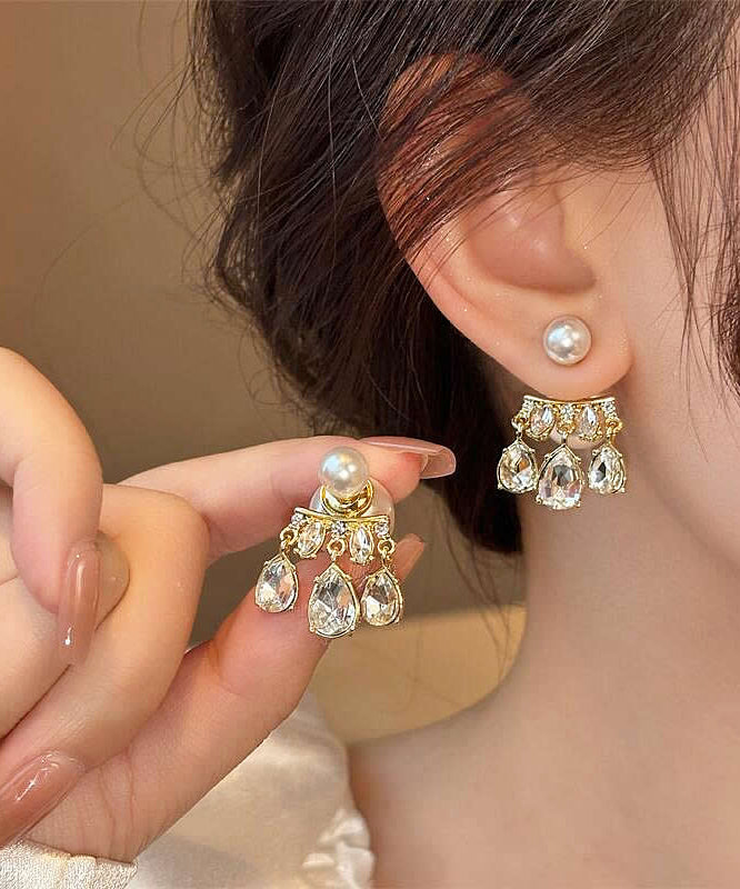 Casual Pink Sterling Silver Inlaid Crystal Pearl Tassel Stud Earrings QQ021