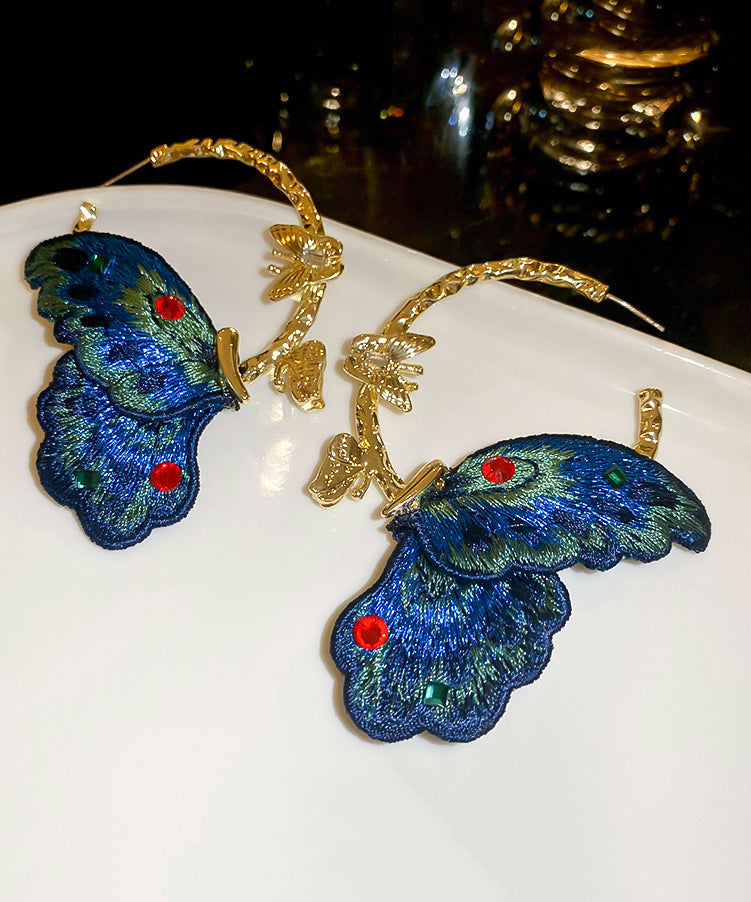 Indulge in the exquisite elegance of these Chinese-inspired Blue Alloy Inlaid Cloth Embroidery Zircon Butterfly Hoop Earrings. Crafted with intricate cloth embroidery and shimmering zircon insets, these earrings are a true masterpiece of style and sophistication.