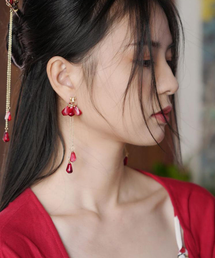 Chinese Style Red Copper Overgild Resin Glass Beads Tassel Drop Earrings QJ036