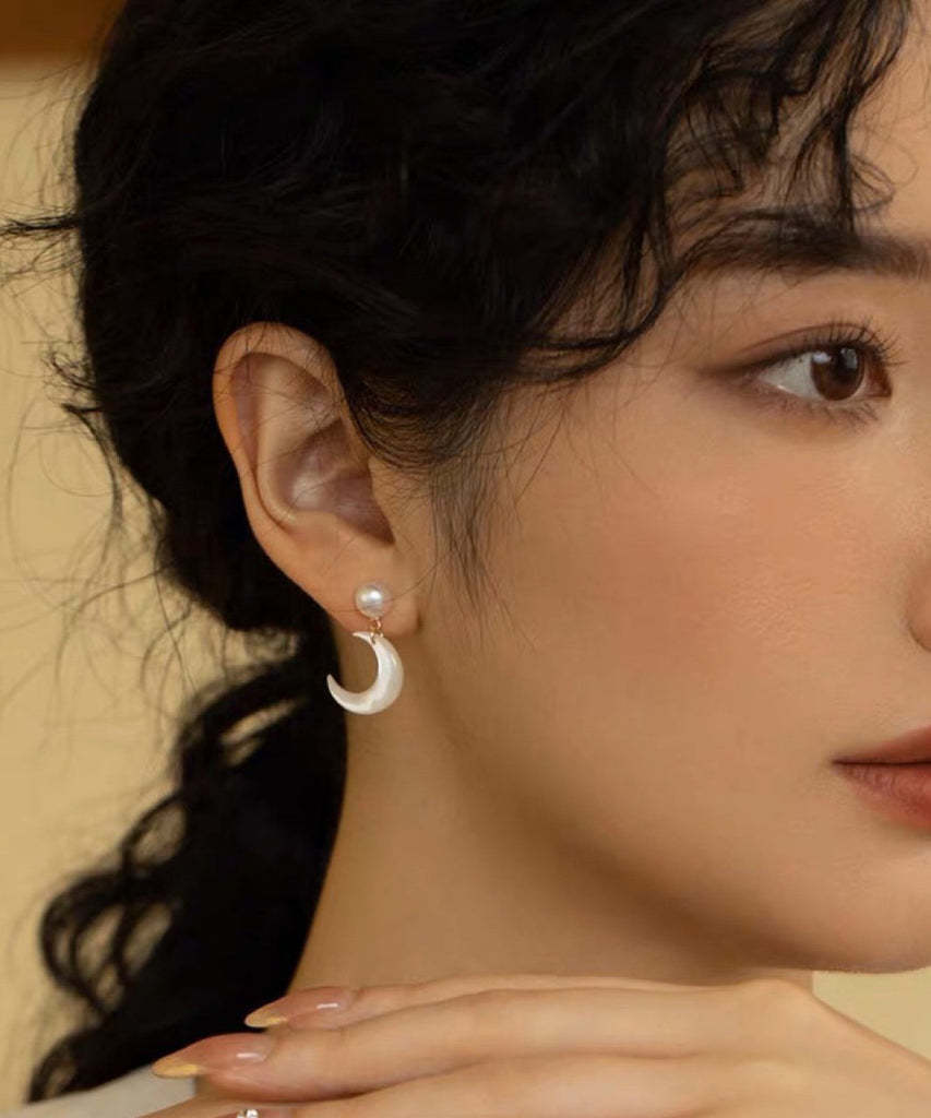 Novelty White Copper Overgild Pearl Moon Stud Earrings