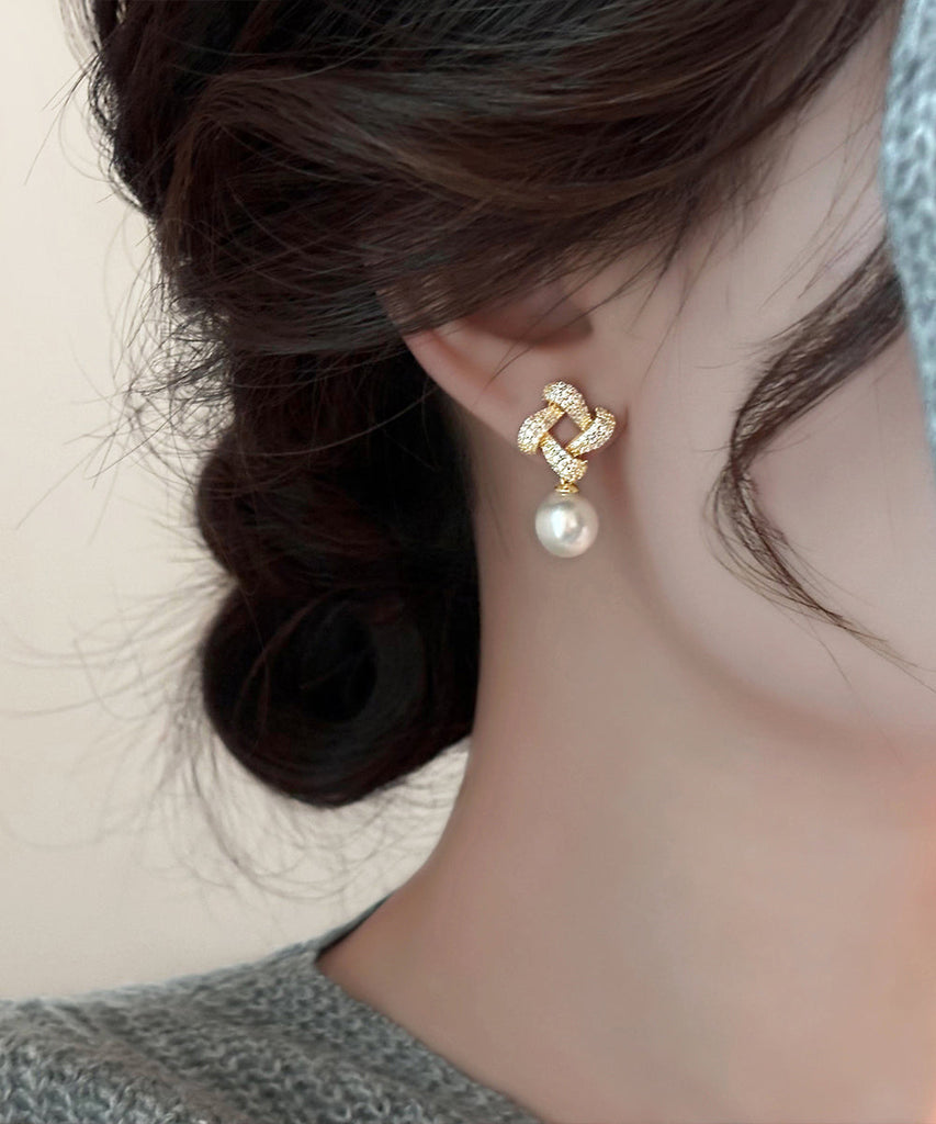 Fine Gold Copper Overgild Zircon Square Pearl Drop Earrings YX014